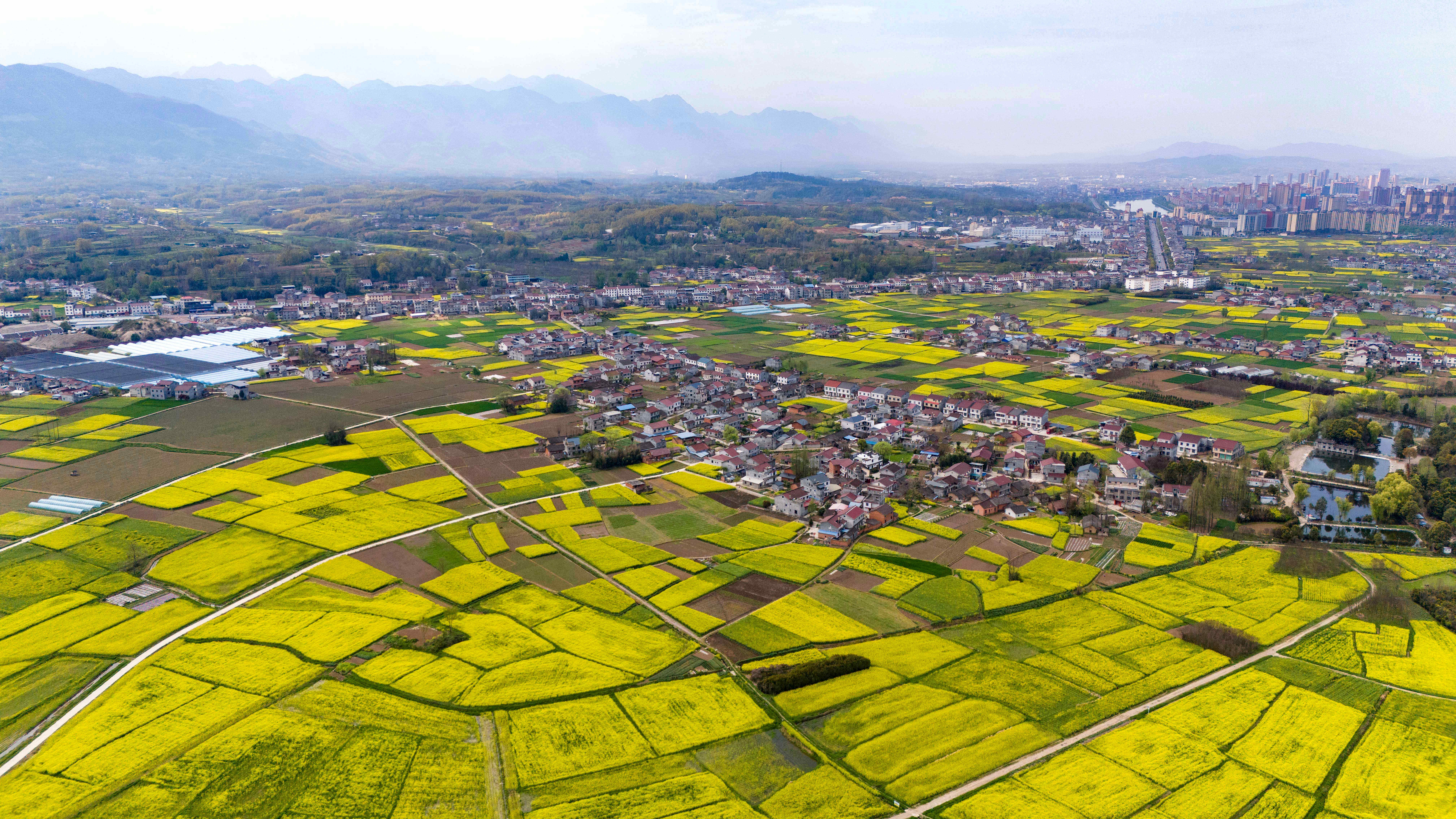 3月28日拍摄的汉中市西乡县城南街说念水东村的油菜花海(无东说念主机像片)。