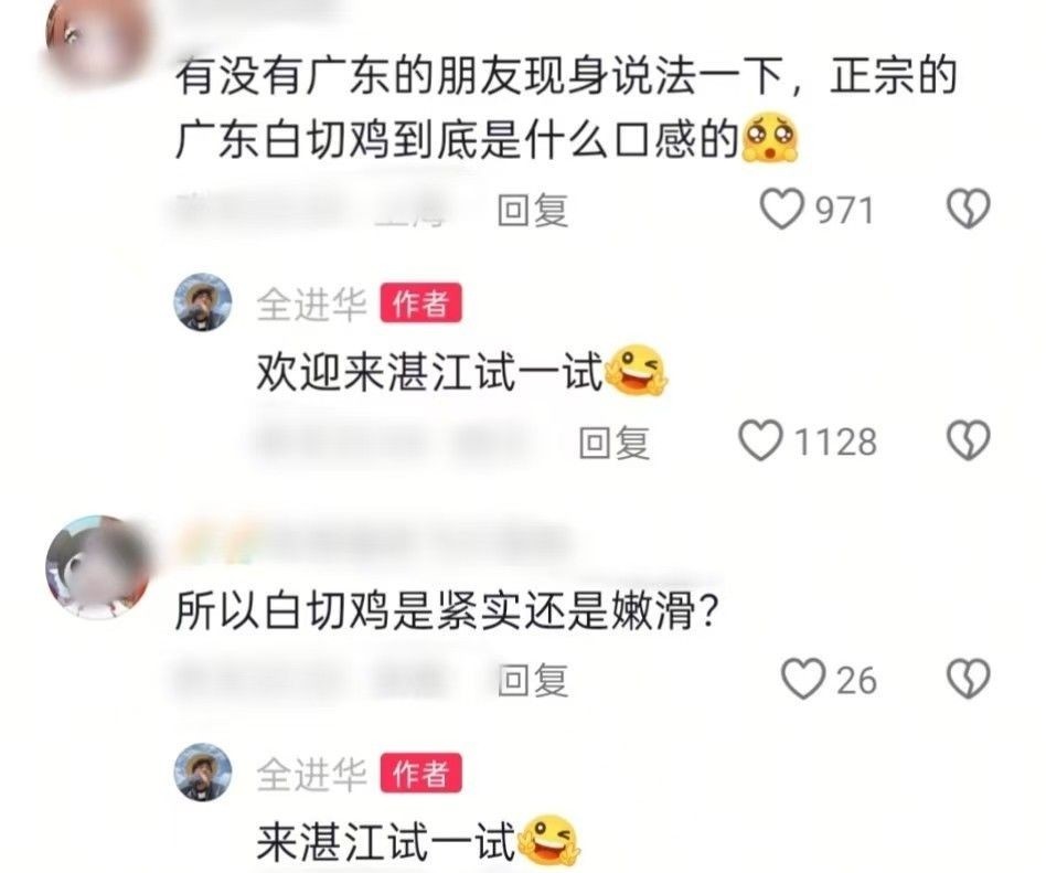 当有网友参谋正统广东白切鸡的口感时,他见原邀请对方来湛江品味。