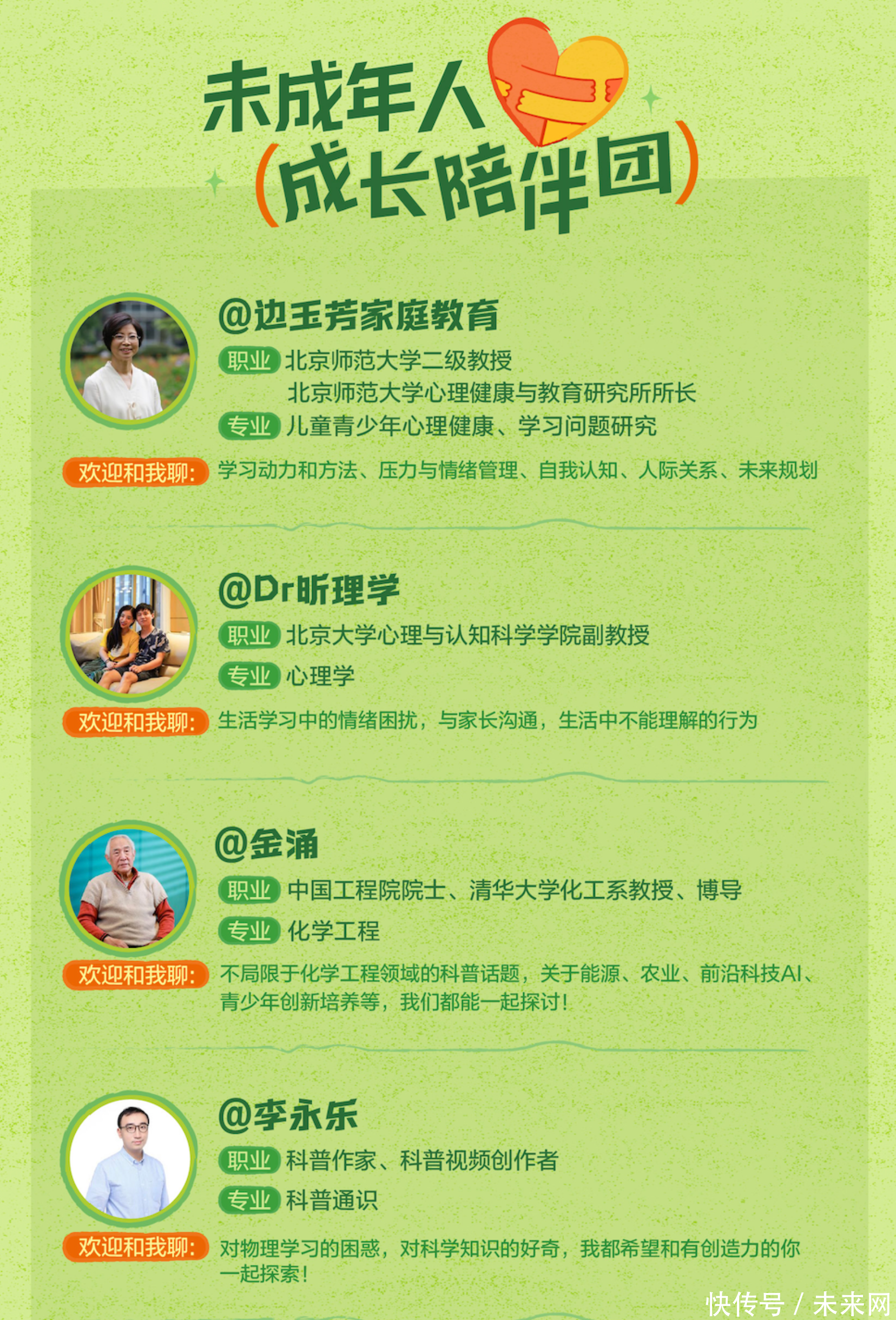 北京师范大学心理健康与拔擢辩论所长处@边玉芳家庭拔擢、北京大学心理与领会科学学院副陶冶@Dr昕理学、中国工程院院士@金涌、科普作者@李永乐、清华大学心理学陶冶@彭凯平陶冶、中国科学院大学陶冶@图灵天下、华南师范大学心理学院陶冶@攸佳宁陶冶、中国拔擢学会青少年序论修营养会布告长@杨敦厚育儿会客厅、 浙江大学医学院附庸儿童病院主任医师@叶庞杂夫、自媒体@子非秋月 10位创作者成为“未成年东谈主成长跟随团”首批成员。