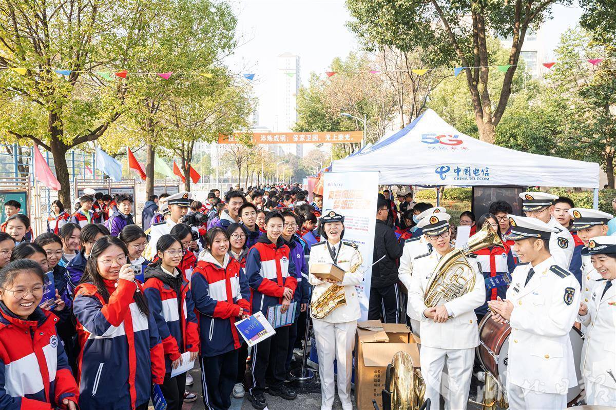 12月6日,襄阳五中的学子们与海工雄兵乐团的学员们互动。当日,戎行院校招生宣传暨国防老师巡讲作为在襄阳五中举行,三军21所招收本科生的顶尖军事院校初度麇集。(湖北日报全媒记者 任勇 曾雅青 通信员 曹翰文 肖云飞 摄)