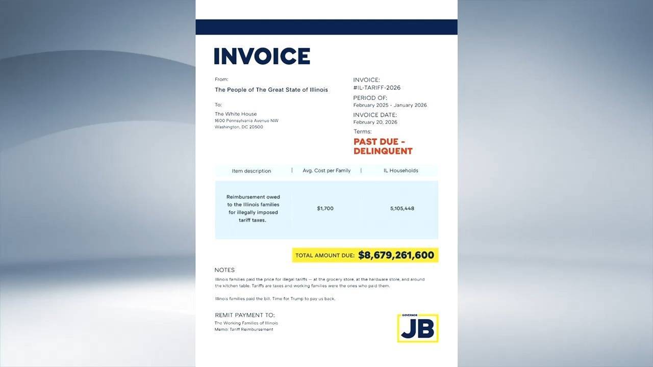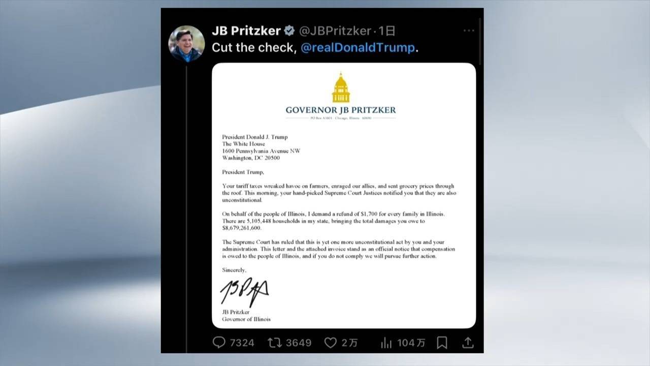 好意思国伊利诺伊州州长、民主党东谈主普里茨克21日致函好意思国总统特朗普,条目为该州每个家庭退还1700好意思元关税,退税总数约87亿好意思元,约合东谈主民币601亿元。普里茨克在酬酢媒体发布了筹办的账单,并配文“请付款”。